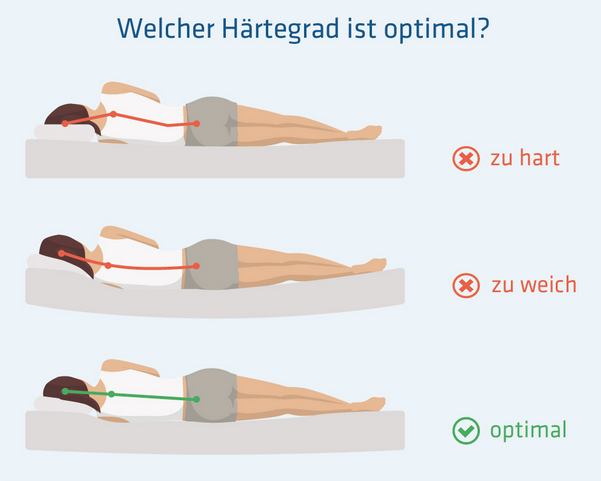 - Seitenschläfer benötigen eine weichere Matratze (eher H2 oder H3), damit Schulter und Becken ausreichend einsinken können und die Wirbelsäule gerade bleibt.
